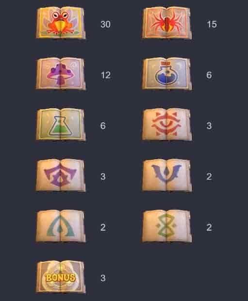 ในตารางนี้ จำนวนสัญลักษณ์ที่ต้องการที่จะได้รับรางวัลคือตั้งแต่ 2 ตัวขึ้นไป โดยสัญลักษณ์พิเศษคือ กบส้ม (Wild) ที่มีการคูณเพิ่มสูงสุดถึง x100 ทำให้มีโอกาสในการชนะรางวัลที่มีค่ามาก นอกจากนี้ ทุกครั้งที่มีการชนะรางวัลต่อเนื่อง ตัวคูณที่แสดงด้านบนจะเพิ่มขึ้นไปเรื่อย ๆ จนถึง x5 ทำให้ผู้เล่นมีโอกาสในการได้รับรางวัลที่มีค่ามากยิ่งขึ้นอีกด้วย ตราบใดที่สัญลักษณ์ประกอบกันให้สมบูรณ์ นักเล่นก็จะได้รับรางวัลทันที ท้าทายและ น่าตื่นเต้น สล็อตพ่อมด ไม่เพียงแต่นำเสนอความสนุกสนาน แต่ยังมีโอกาสในการได้รับรางวัลที่มีค่าอย่างมากมาย